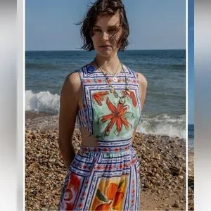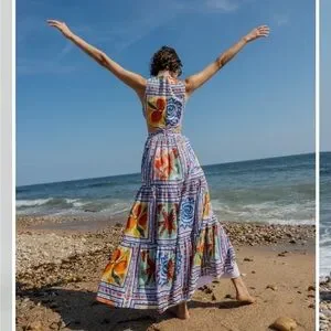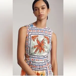 Sleeveless A-Line Maxi Dress size 6. Vibrant sleeveless dress with a floral pattern. Features a mix of orange, blue, and white colors.