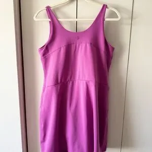 Sporty scoop-back dress with a fitted bodice and slight flare. Tank straps for easy movement. Smooth stretch fabric in a bright pink tone. Subtle seam details across the back.