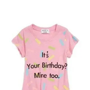 Celebrate with the Girls It's Your Birthday? Mine Too T-shirt by WILDFOX, featuring a playful multi-colored sprinkles and statement print. Crafted with short sleeves and a crewneck for a comfortable fit, this tee is perfect for a festive summer occasion. Made in a fun pink hue, it captures a minimalist trend that's sure to make a statement. Care: Machine wash. Soft, soft. bundle two wildfox tees to receive 20% off. size 5 is 5/6 on tag. 7 is size 7/8