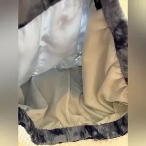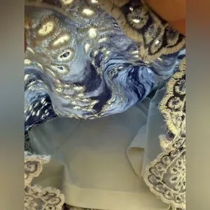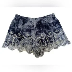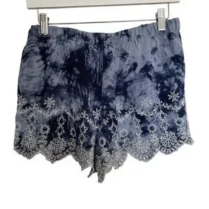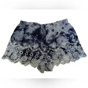 Lightweight tie-dye shorts with elastic waist. Navy blue color with white embroidered lace trim with scalloped hem. Inner short liner.