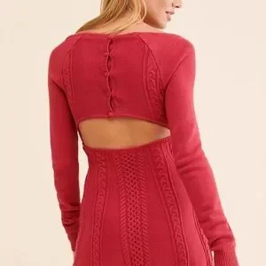 Chic cranberry knit mini dress with long sleeves and open back. Features a flattering fit and intricate knit pattern. Ideal for stylish outings.