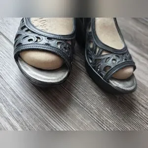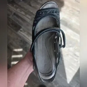 Blue leather cutout women's Naot Deluxe wedge sandals with adjustable strap. Sz US 5.5 37.