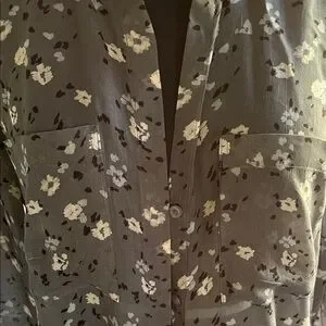 Soft olive button-down blouse with a relaxed silhouette. Features a small white floral print and classic collar. Lightweight fabric drapes nicely. Easy to pair with jeans or skirts.NWOT