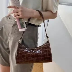 This stylish brown shoulder bag features a sophisticated crocodile-embossed design. Perfect for adding a touch of elegance to any outfit.