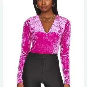 Chic pink velvet bodysuit with a flattering V-neck. Long sleeves for a sleek look. Perfect for stylish outings. Only worn one time so it is in brand new condition..
