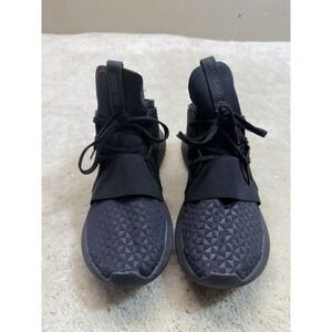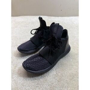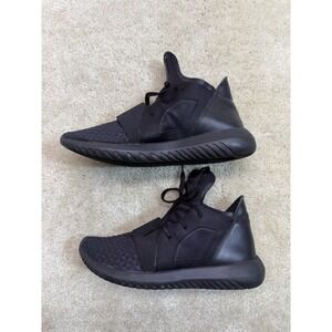 The Adidas Tubular Defiant Shoes in women's size 8 are sleek black sneakers designed for outdoor activities. Featuring a comfortable lace-up closure and breathable knit upper, these athletic shoes are perfect for gym workouts, walking, and running. The subtle lace and logo accents add a touch of sporty style to the solid black color, making them a versatile option for any active woman. Made with a blended fabric, these Adidas Tubular Defiant Shoes offer both style and performance in one classic sneaker design.