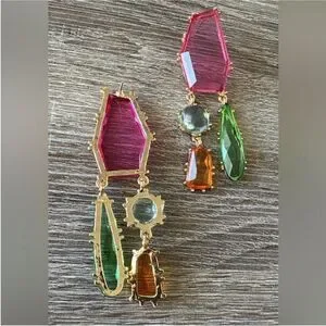 Add a pop of color to your outfit with these vibrant geometric drop earrings. Featuring pink, green, blue, and orange hues, these earrings are perfect for any occasion.