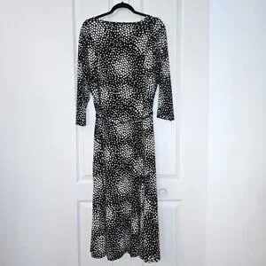 🏷️Style Tags: Maxi, Long Dress, Belted, Plus Size, Stretchy, Career, Workwear, Business Casual, 3/4 Sleeve, Abstract Print, Canadian Brand, Confetti Print, Monochrome