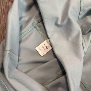 mint or aqua color, high-waisted fit, and distinctive side-pocket construction with decorative horizontal stitching or stripes near the ankles