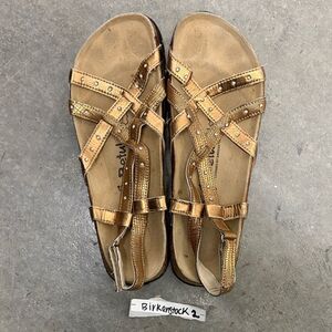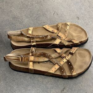 Stylish metallic sandals with crisscross straps. Perfect for everyday wear.