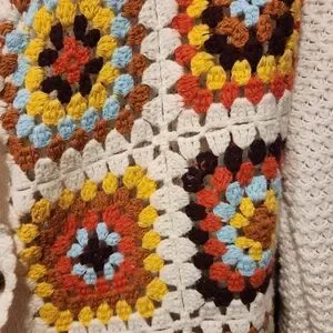 Vibrant crochet design with button details. Perfect for layering.