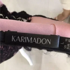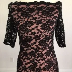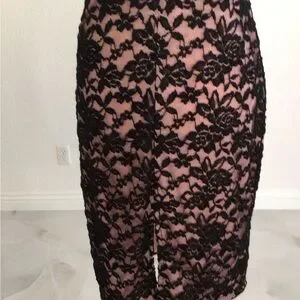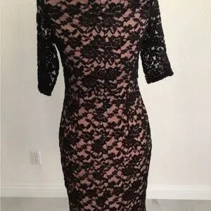 This is a black floral lace overlay sheath dress with a pink lining underneath, creating a striking contrast. Key features include: