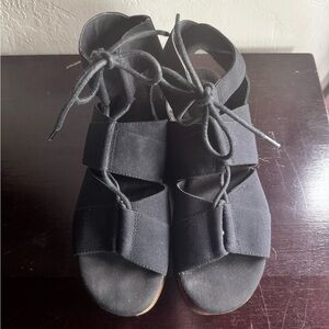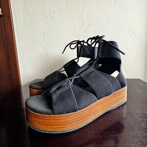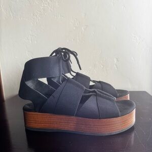 Soft and stretchy lace-up elastic straps and a wood-look sole offer a modern take on a gladiator sandal in this cool, elevated flatform. 1 3/4" platform Lace-up style Textile upper/synthetic lining/rubber and synthetic sole.