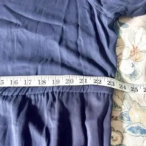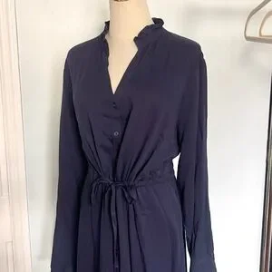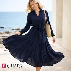 Chaps est 1978, Navy Button Front Ruffle Cuff Maxi Shirt Dress Tie Waist Boho Women Size L …This elegant navy blue dress is perfect for any occasion. Its sophisticated design and flattering fit make it a must-have in your wardrobe. A timeless navy blue Chaps maxi shirt dress with a soft drape and feminine details — perfect for effortless everyday elegance. Features a button-front bodice, elastic + drawstring cinched waist, long sleeves with subtle ruffle cuffs, and a tiered skirt with beautiful movement.