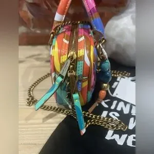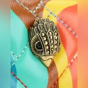 Crossbody Bag features: 100% leather exterior in a multicolored swirl pattern Zip closure 100% polyester lining Brass eagle head ornament Interior: back with kindness message open pocket Double handle & single strap
