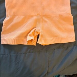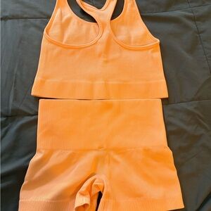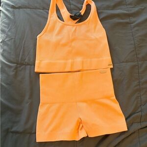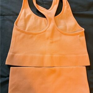 Coral ribbed set with silver branded tags. Stylish and comfortable.