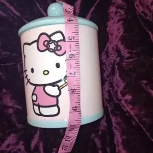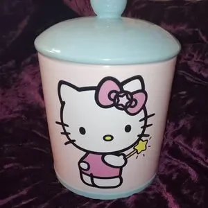 Cute Hello Kitty storage jar with a pink body and blue lid. Features Hello Kitty holding a star wand.