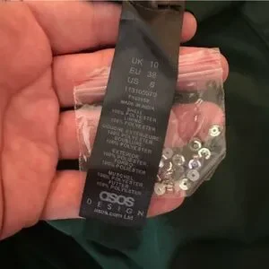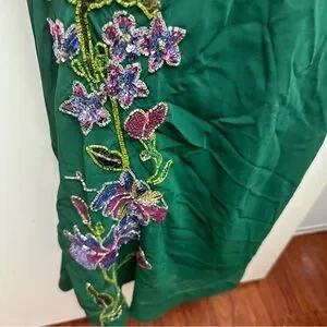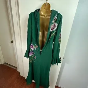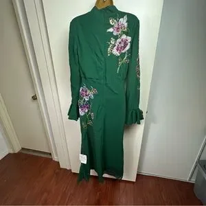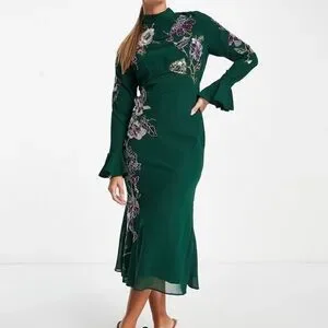 Elegant green midi dress by ASOS. High neckline and long sleeves. Floral embroidery in pink and purple accents. Subtle ruffle cuffs. Fitted waist for a flattering silhouette.