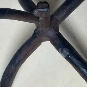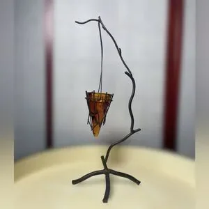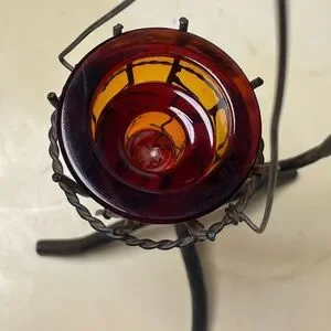 This piece is so unique! Dark wrought iron stand designed to look like a stylized tree branch with a beautiful amber or orange colored glass candle holder. A tea light would work perfectly with this holder. It has a small flaw on the bottom, which is shown in photos, but still in excellent condition!