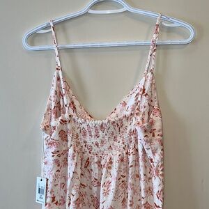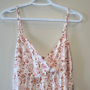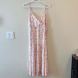 Elegant floral maxi dress with spaghetti straps. Features a beautiful pink and white pattern.
