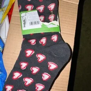 Soft crew socks by kate spade. White base with layered red and black heart motif. Comfortable knit for everyday wear. Cute, modern detail at the ankle.