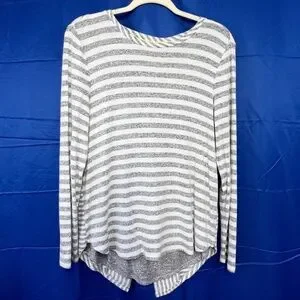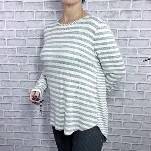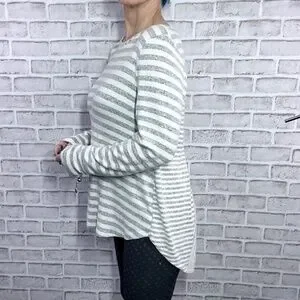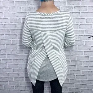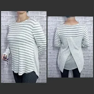 New condition. Sooo SOFFFFT. White and heather grey stripes with fun split in the back with grey backing. Size Small (I'm usually a size Medium for reference, in pics). The chest measures 18.5 across pit to pit.