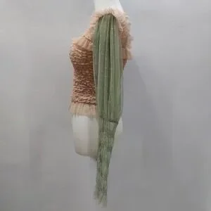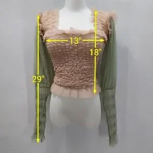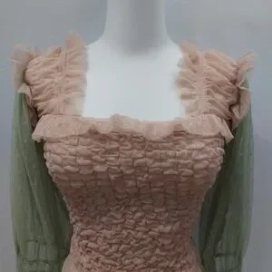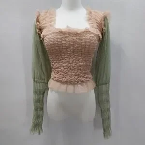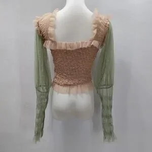 Smocked bodice top features a textured popcorn knit in a soft peach hue, complemented by contrasting sage green mesh sleeves. The square neckline is framed by delicate ruffled trim, while the long sleeves showcase a sheer polka dot tulle texture with dramatic smocked cuffs and ruffle detailing at the wrists. A feminine peplum-style ruffle finishes the hem, creating a romantic and ethereal silhouette.