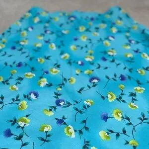 Vibrant turquoise A-line skirt with a scattered floral print. Features small yellow and blue blossoms with delicate black stems. Smooth fabric that drapes nicely. Easy-to-style piece for spring and summer outfits.