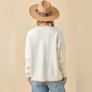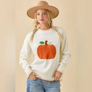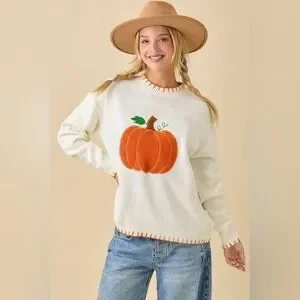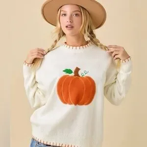 Bring on the cider, hayrides, and compliments! This sweater's oversized pumpkin patch design and stitched trim give all the fall feels in one cozy piece.