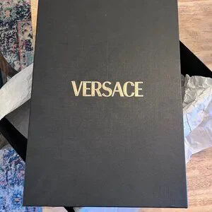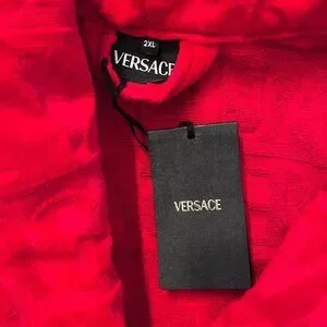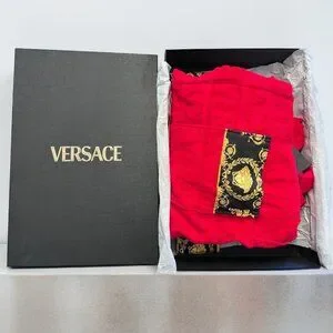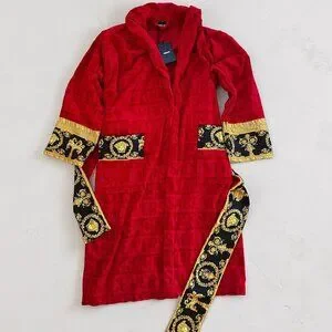 Brand new Versace Robe.S tyled in the brand's logo print and detailed with signature Barocco trim, crafted of luxe Italian cotton. This lush piece features a waist tie and side patch pockets.