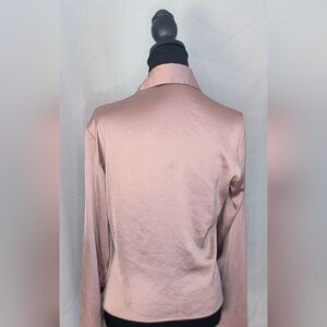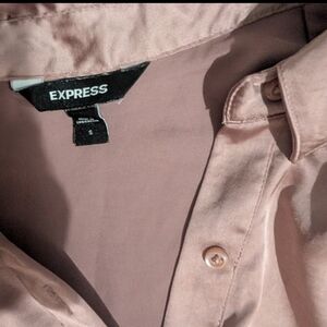 Chic satin button-up blouse from Express in a beautiful soft blush pink tone. This stylish top features a classic collar, long sleeves, and a flattering front tie detail that adds a modern feminine touch.