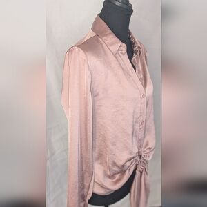 Express Long Sleeve Satin Tie Front Button Down Blouse in Blush Size S