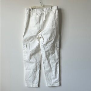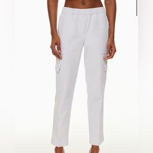 Aritzia Babaton Titan cargo pants in white. Features elastic waistband, utility pockets, and a relaxed fit. Retail $128.