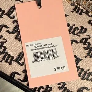 Brand new with tags Juicy Couture mini shoulder bag in a rare sandstone color with all-over monogram print. Features gold-tone hardware, rhinestone Juicy logo, and signature heart charm.
