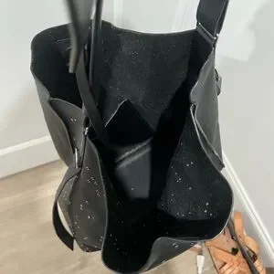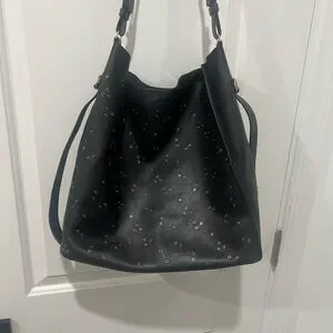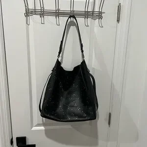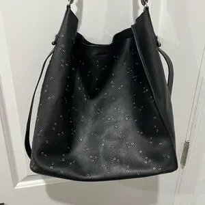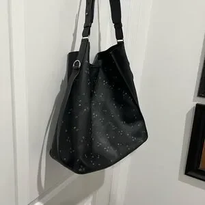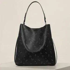 Elegant black tote with subtle stud embellishments for a refined look. Smooth leather construction with a comfortable top handle. Versatile style that complements both day and evening outfits. Includes an adjustable shoulder strap for added convenience.