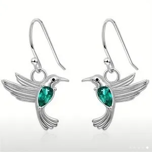 Delicate silver hummingbird drop earrings featuring an emerald green teardrop crystal. Lightweight design with polished silver-tone finish. Elegant, nature-inspired accessory that adds a pop of green to any outfit.