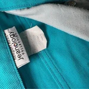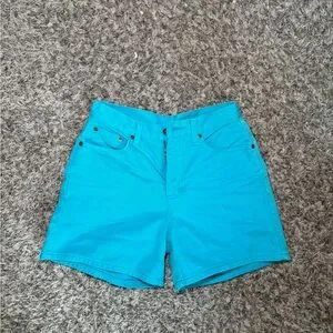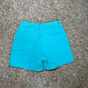 Vibrant turquoise high-waist shorts. Classic five-pocket styling with front button and zip. Lightweight cotton fabric. Clean, simple silhouette ready to wear. Size 6