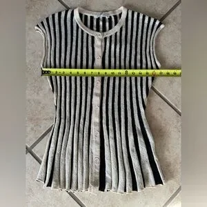 Elegant cream knit top with vertical black stripes. Cap sleeves and button-front detail create a polished look. Lightweight, ribbed fit flatters the waist. Perfect for casual or office outfits. Cream and black colorway adds timeless versatility.
