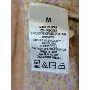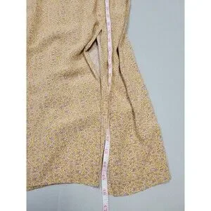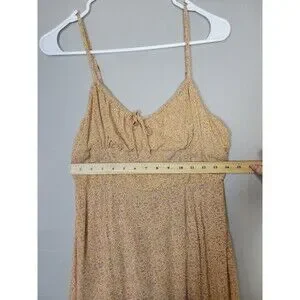 This cute dress perfectly embodies the Prairie/Cottagecore aesthetic that is so wildly popular. Is is a lightweight, soft viscose with a beige base and gold/purple tiny flowers. It has adjustable spaghetti straps, a slim fit, a bow accent, and a front/side slit. It is midi length. Machine washable for easy care.