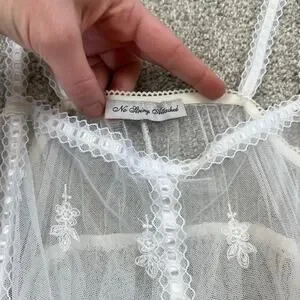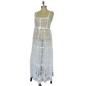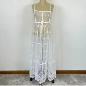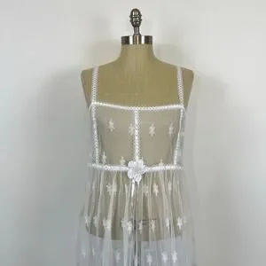 Vintage No Strings Attached Sheer White Floral Coverup Bridal Night Gown Dress. Original label has been removed, but fits like a size M and I included more measurements below for the perfect fit. High quality and in good condition. Sheer material with floral embroidered detailing and front beaded flower accent. Perfect to wear as lingerie, bridal getting ready gown, or to wear over a slip.