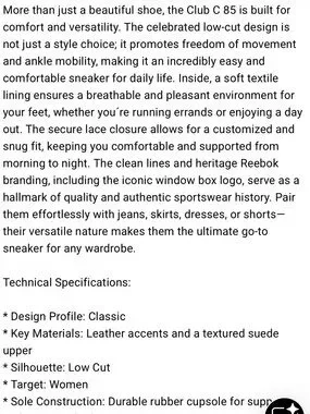 More than just a beautiful shoe, the Club C 85 is built for comfort and versatility. The celebrated low-cut design is not just a style choice; it promotes freedom of movement and ankle mobility, making it an incredibly easy and comfortable sneaker for daily life. Inside, a soft textile lining ensures a breathable and pleasant environment for your feet, whether you´re running errands or enjoying a day out.