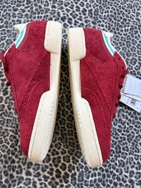 Suede Reebok sneakers in deep red. White tongue and heel lining. Light cream sole and blue heel stripe. Lace-up closure with padded collar.