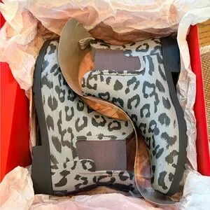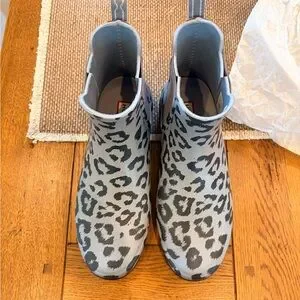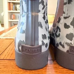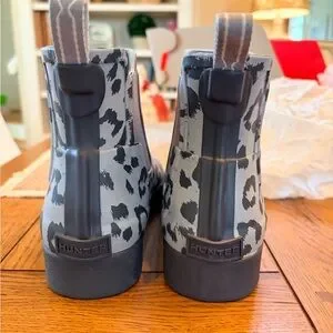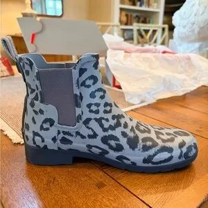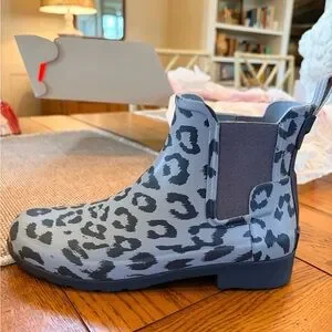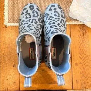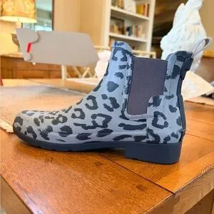 Hunter Chelsea rain boot with bluish/gray leopard print. Elastic side panels for easy on and off. Waterproof rubber construction protects from wet weather. Pull tabs aid quick wearing. Sleek ankle height for versatile styling. Very stylish and comfortable. These boots are in excellent condition and come from a non smoking and very clean home. NO RETURNS AND NO INTERNATIONAL SALES.