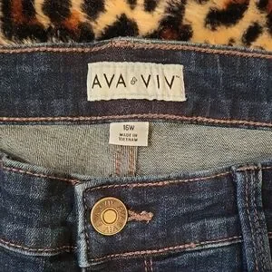 Ava & Viv high-rise jeans in a dark indigo wash. Button-fly front with exposed metal buttons. Slim, tapered leg for a streamlined fit. Stretch denim with light fading at thighs and knees.