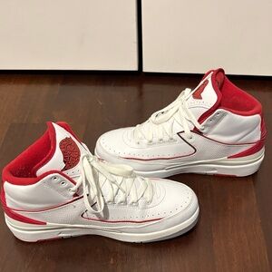 The Air Jordan 2 Retro Chicago Home is one of the original Jordan colorways, known for its clean, classic look inspired by the Chicago Bulls. It features a premium white leather upper with a subtle faux lizard-skin texture, giving it a more luxury feel compared to other Jordans