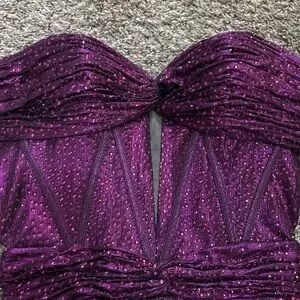 Eye-catching strapless mini dress in deep purple with all-over sequins. Designed for a fitted, flattering silhouette. Sparkling finish adds glamour for evening events. Pair with heels for a standout look.