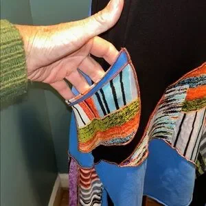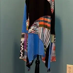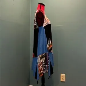 Sleeveless dress with colorful patchwork stripes and abstract panels. Handkerchief hem with draped silhouette. Bold blue and black focal colors with multicolor accents, pockets, 42 inch length, 20 inches pit to pit, 23 inch waist, 30 inch hips.