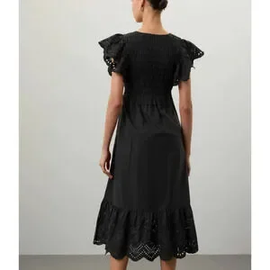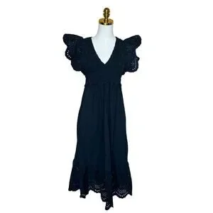 Rails Black Eyelet Midi Dress SMALL Smocked Cottagcore Ruffle Cotton Designer $268
