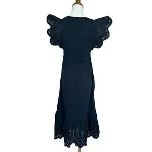 Rails Black Eyelet Midi Dress SMALL Smocked Cottage Ruffle Cotton Designer $268