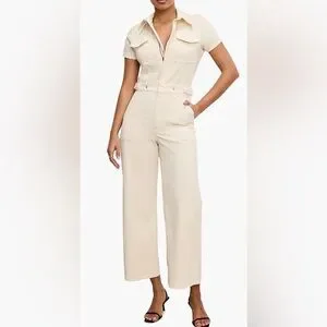 Good American Fit For Success Twill Palazzo Crop Jumpsuit in Ecru, Size: Large